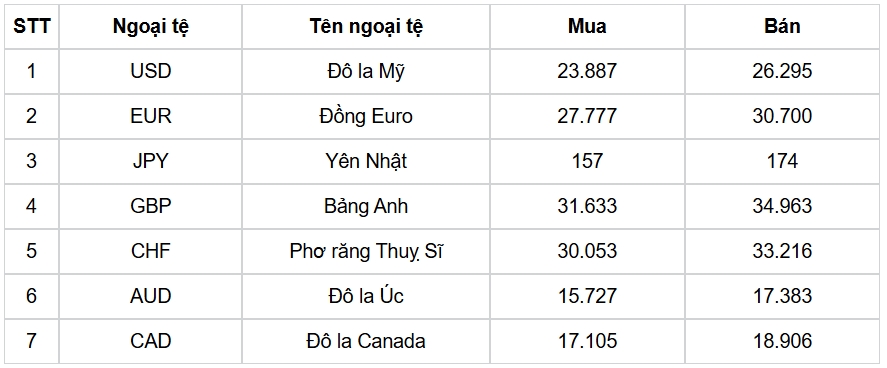 Cập nhật trong phiên làm việc đầu tiên ngày thứ Năm, tỷ giá trung tâm tại NHNN công bố tại 25.091 đồng/USD, không đổi so với hôm qua. Cùng lúc, giá bán USD ở các ngân hàng thương mại lớn đồng loạt công bố tại cùng mốc 26.345 đồng/USD, bằng với mức niêm yết kết thúc ngày thứ Tư. Chỉ số USD Index (DXY) ở quanh mức 98,06 điểm.