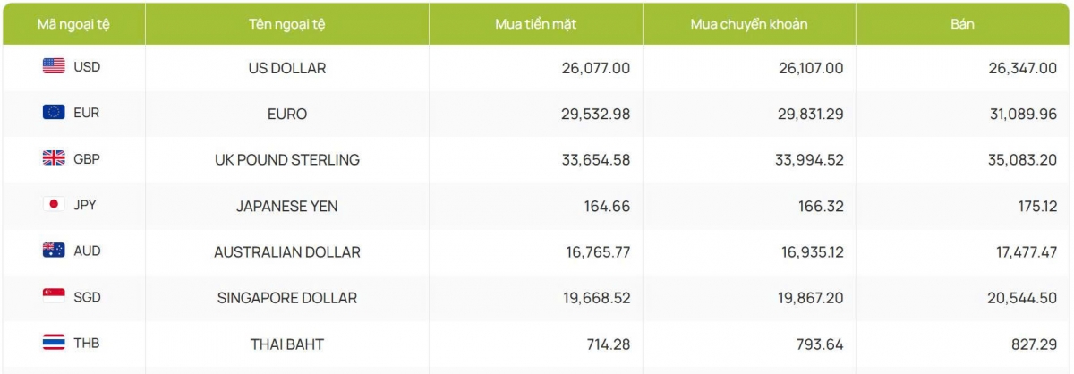 Tại ACB bước sang tuần mới giữ nguyên cả hai chiều từ công bố phiên trước, hiện giao dịch với 26.100 đồng/USD mua vào và 26.347 đồng/USD bán ra.