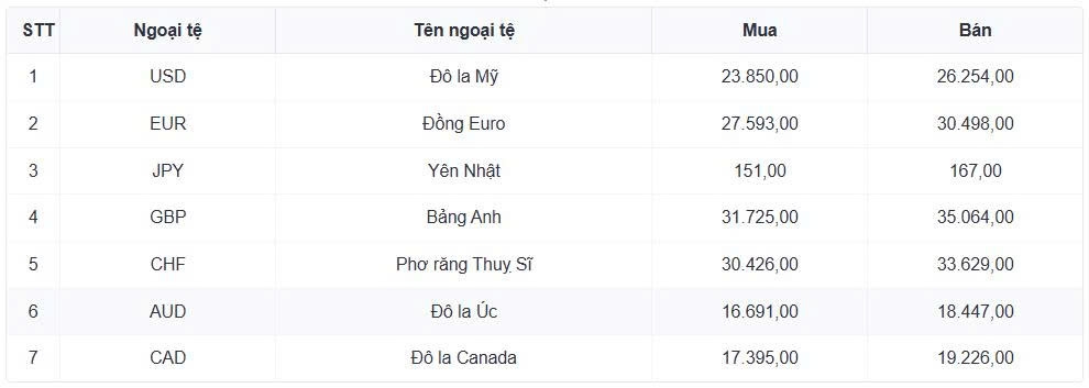Tỷ giá các ngoại tệ mạnh khác trong giỏ thanh toán quốc tế, tại Ngân hàng Vietcombank được niêm yết như sau: