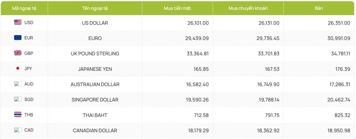 Kết thúc ngày thứ Tư, giá bán USD tại một số ngân hàng thương mại lớn đồng loạt tạm nghỉ ở cùng mức là 26.351 đồng/USD, không đổi so với phiên liền trước. Chỉ số USD Index (DXY) hiện ở mức 100,22 điểm.