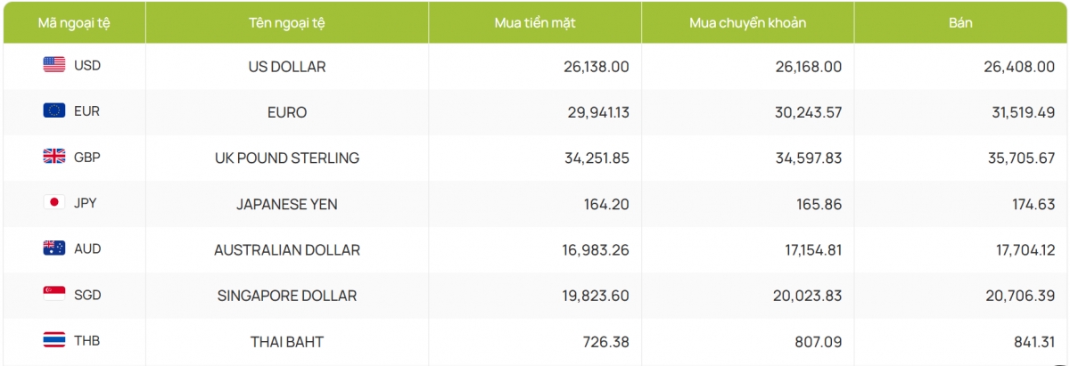 Ngân hàng Vietcombank niêm yết tại 26.138 - 26.408 đồng/USD (mua vào và bán ra), giữ nguyên từ công bố phiên trước.
