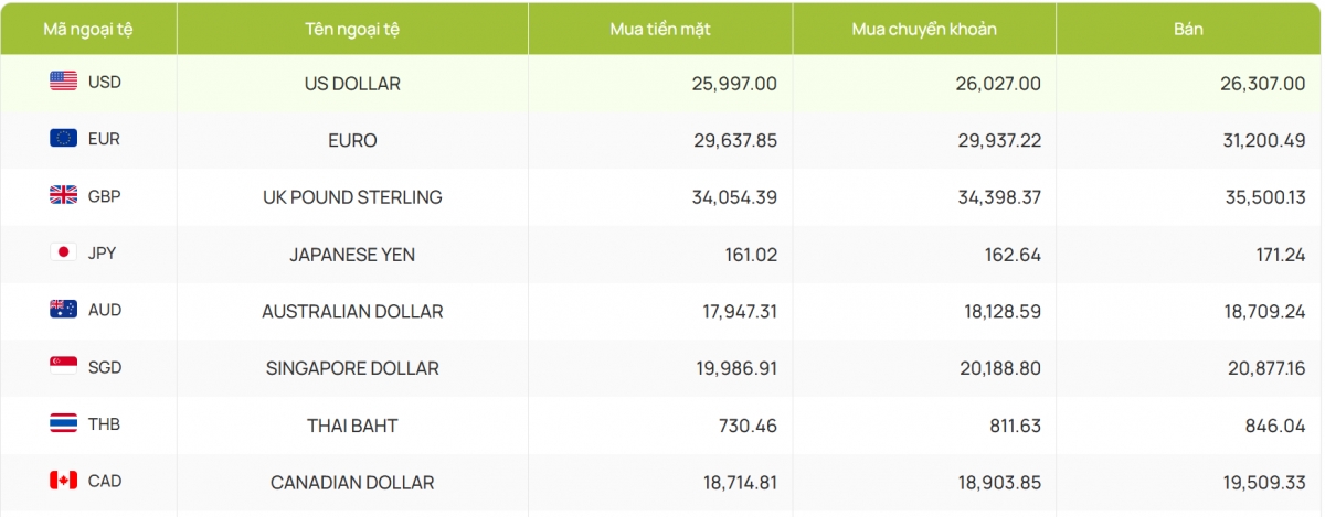 Cụ thể, ngân hàng Vietcombank công bố giao dịch tại 25.999 - 26.309 đồng/USD (mua vào và bán ra), cao hơn phiên liền trước 2 đồng cả hai chiều.
