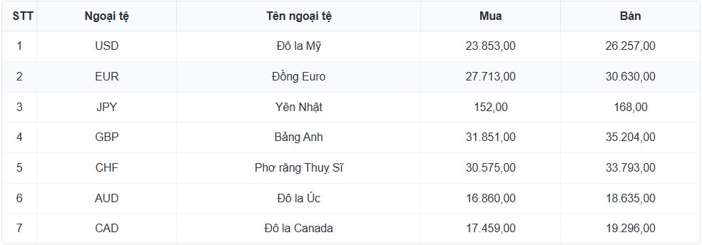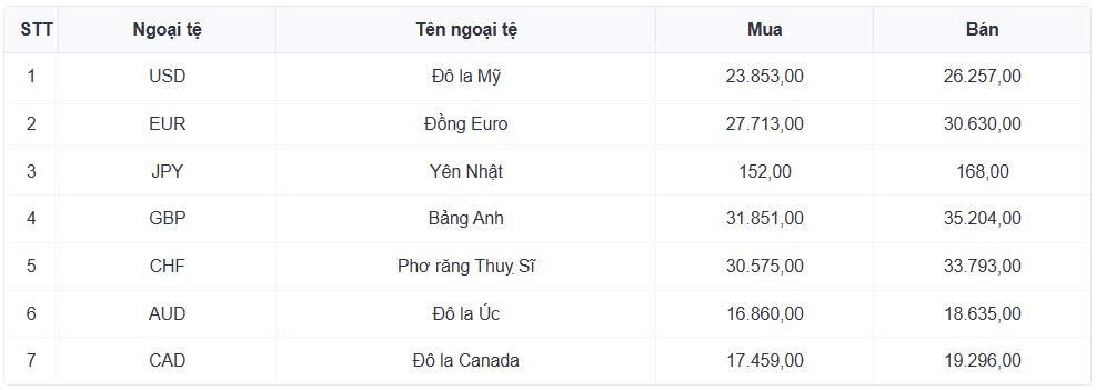 Tỷ giá các ngoại tệ mạnh khác trong giỏ thanh toán quốc tế, tại Ngân hàng Vietcombank được niêm yết như sau: