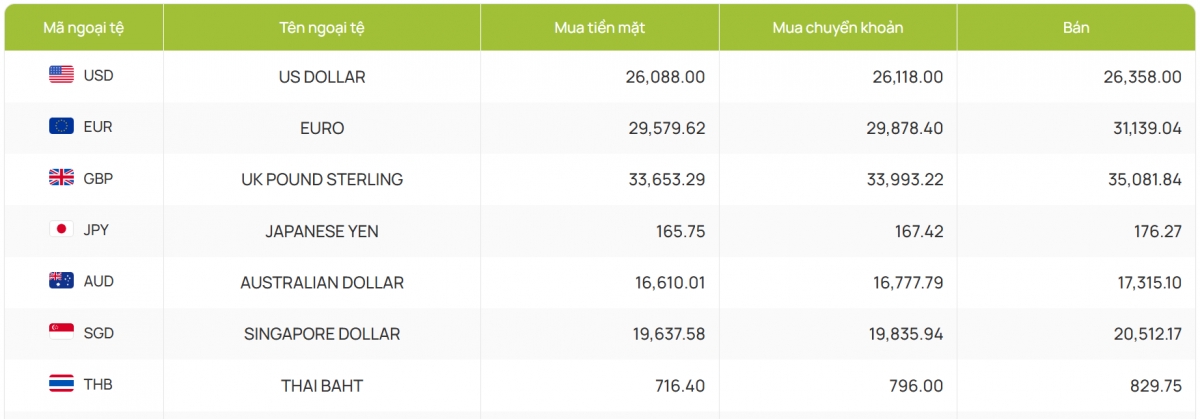 Ngân hàng Vietcombank niêm yết tại 26.088 - 26.358 đồng/USD (mua vào và bán ra), không thay đổi so với phiên trước.