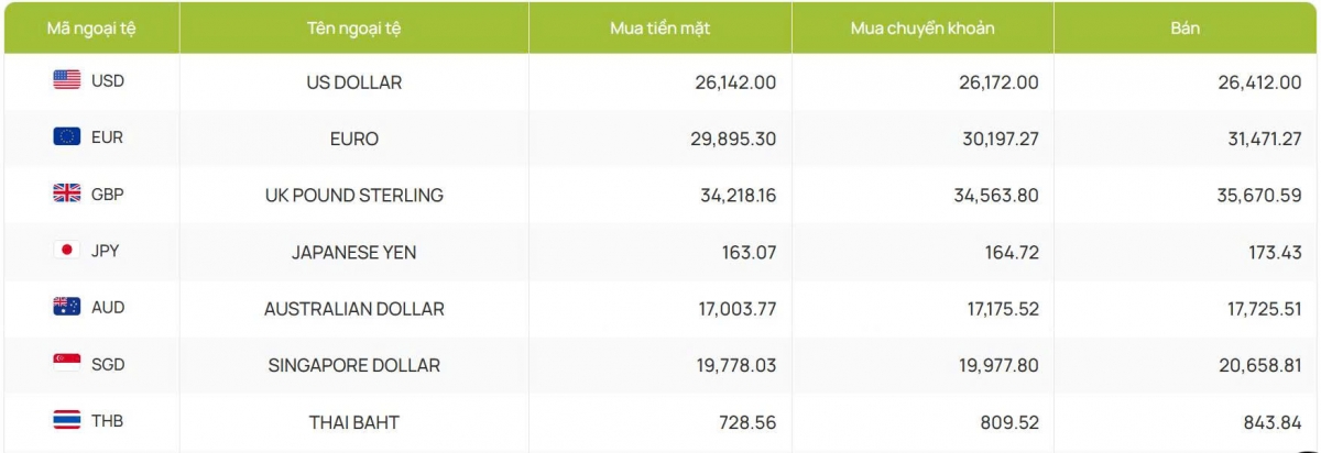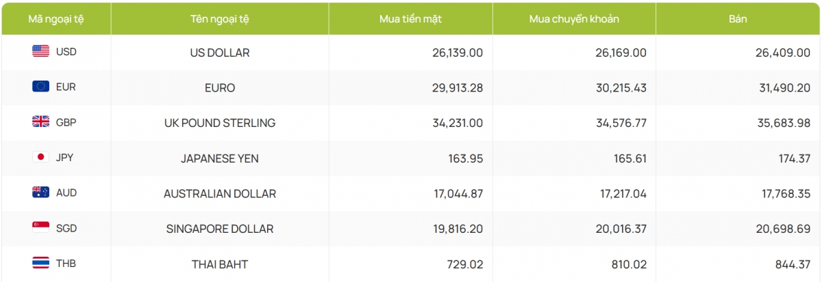 Còn ACB bắt đầu hôm nay với 26.150 đồng/USD mua vào và 26.412 đồng/USD bán ra, không điều chỉnh mới giá mua còn giá bán nâng lên cao hơn phiên trước 3 đồng.