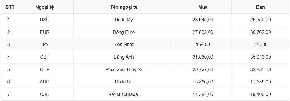 Tỷ giá các ngoại tệ mạnh khác trong giỏ thanh toán quốc tế, tại Ngân hàng Vietcombank được niêm yết như sau: