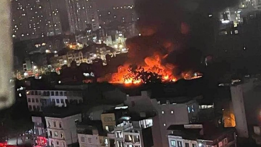VOV.VN - Kho hàng đồ chơi trẻ em rộng 250m2 trong ngõ 115 Định Công (quận Hoàng Mai, Hà Nội) bốc cháy dữ dội trong đêm, khiến một số kho hàng và nhà dân liền kề bị ảnh hưởng.