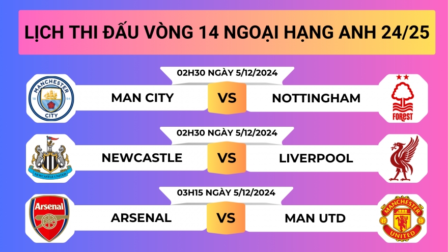 VOV.VN - Lịch thi đấu và trực tiếp vòng 14 Ngoại hạng Anh 2024/2025: Tâm điểm sẽ là trận đại chiến giữa Arsenal và MU diễn ra trên sân vận động Emirates.