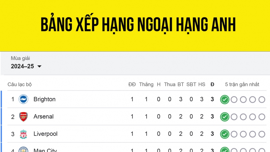 VOV.VN - Cập nhật bảng xếp hạng Ngoại hạng Anh 2024/2025 mới nhất sau vòng đấu đầu tiên, Brighton đang tạm dẫn đầu với 3 điểm và hiệu số +3, trong khi đó Arsenal, Man City hay Liverpool đứng kế tiếp.
