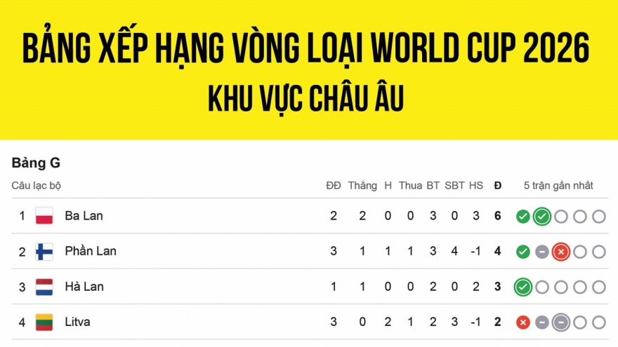 Bảng xếp hạng vòng loại World Cup 2026 khu vực châu Âu mới nhấtVOV.VN - Bảng xếp hạng vòng loại World Cup 2026 khu vực châu Âu mới nhất tính đến ngày 11/6.