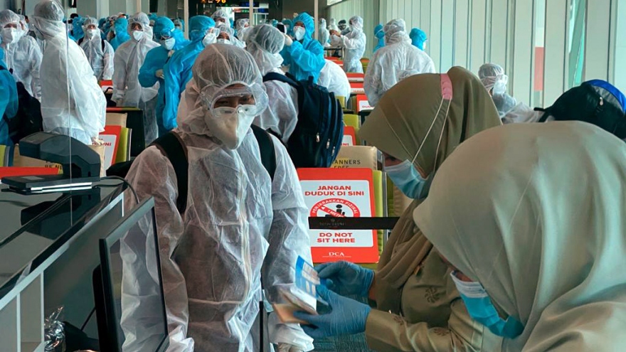 VOV.VN - Ngay sau khi hạ cánh an toàn xuống sân bay quốc tế Nội Bài, những người tham gia chuyến bay đã được kiểm tra y tế và đưa về cơ sở cách ly tập trung theo đúng quy định.
