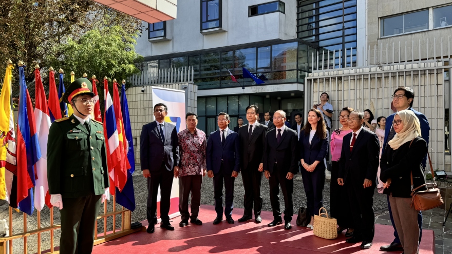 VOV.VN - Ngày 8/8, Đại sứ quán Việt Nam tại Pháp đã trang trọng tổ chức lễ thượng cờ Hiệp hội các quốc gia Đông Nam Á (ASEAN) nhân dịp kỷ niệm 57 năm ngày thành lập (8/8/1967-8/8/2024).