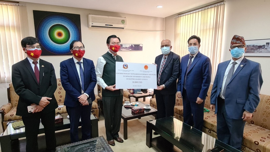 VOV.VN - Chiều 24/5, tại New Delhi, Ấn Độ, Đại sứ Việt Nam tại Ấn Độ, kiêm nhiệm Vương quốc Nepal Phạm Sanh Châu đã trao tượng trưng tới Đại sứ Nepal tại Ấn Độ khoản tiền 30.000 USD của Chính phủ Việt Nam hỗ trợ Chính phủ và nhân dân Nepal để phòng chống dịch bệnh Covid-19.