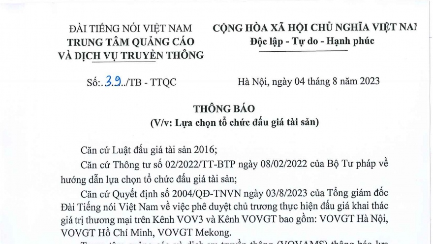 VOV thông báo Kết quả lựa chọn tổ chức bán đấu giá tài sản