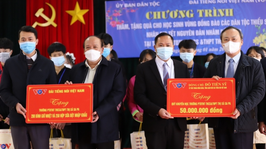 VOV.VN - Chiều 13/1, Đoàn công tác của Đài Tiếng nói Việt Nam (VOV) và Ủy ban Dân tộc đã tới thăm hỏi, tặng quà cho học sinh, đồng bào dân tộc thiểu số ở thị xã Sa Pa, tỉnh Lào Cai nhân dịp Tết Nguyên đán sắp đến.