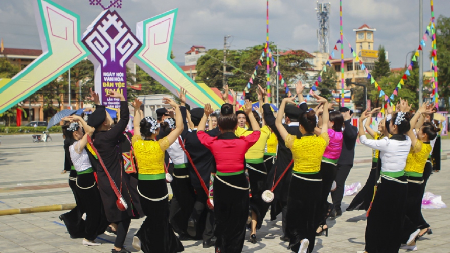 VOV.VN - Dưới ánh lửa bập bùng, trai gái tay trong tay, chân bước nhịp nhàng theo điệu nhạc của tiếng trống, tiếng chiêng, cùng vui say trong điệu xòe Thái.