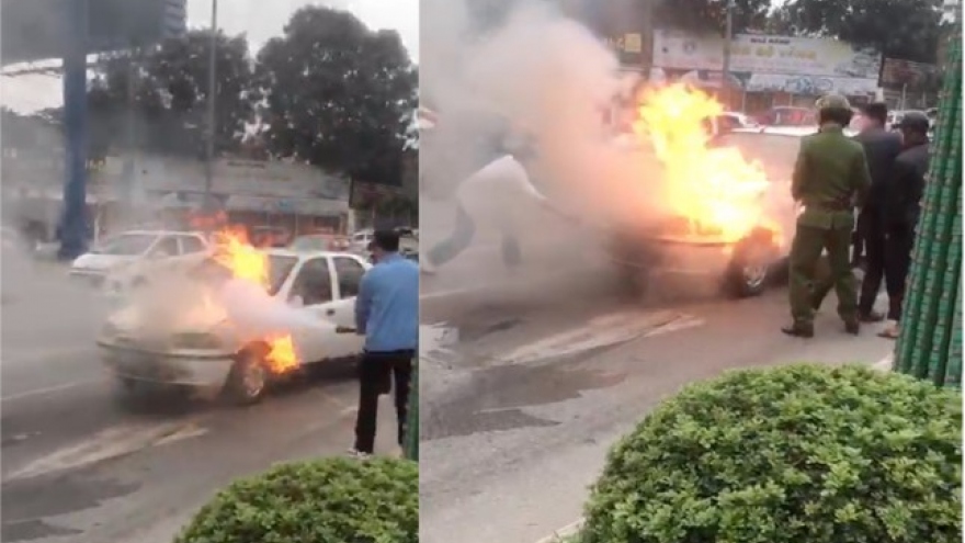 Đang lưu thông trên đường Trần Phú (TP. Vinh, Nghệ An), chiếc ô tô con bất ngờ bốc cháy dữ dội. May mắn, chủ xe đã kịp thoát ra ngoài nên không có ai bị thương trong vụ việc.
