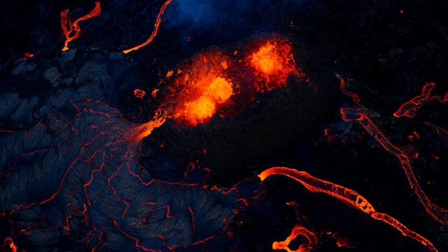 VOV.VN - Những dòng dung nham đỏ rực phun trào từ núi lửa ở Iceland, ánh lửa đỏ rực tại một nhà hỏa táng bệnh nhân chết vì Covid-19 ở Ấn Độ, hay bức tranh vẽ trên cát để nhấn mạnh tác động của biến đổi khí hậu… là những bức ảnh chụp từ trên cao ấn tượng trong năm 2021.