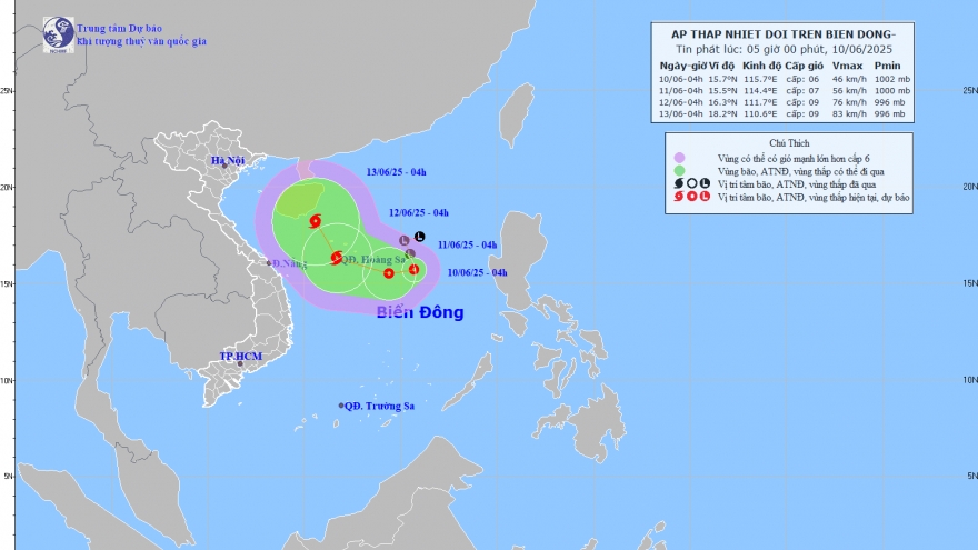 VOV.VN - Theo Trung tâm Dự báo Khí tượng thủy văn Quốc gia, hồi 4h ngày 10/6, vị trí tâm áp thấp nhiệt đới ở vào khoảng 15,7 độ Vĩ Bắc; 115,7 độ Kinh Đông, cách quần đảo Hoàng Sa khoảng 360km về phía Đông Đông Nam.