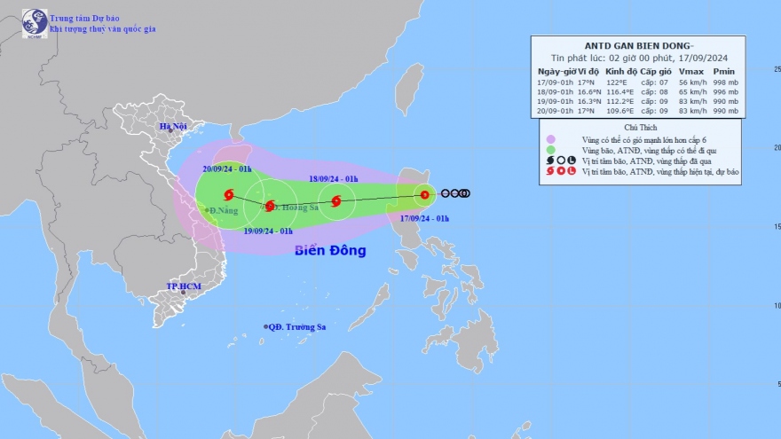 VOV.VN - Dự báo trong 24 đến 48h tới, Áp thấp nhiệt đới có khả năng mạnh lên thành bão, cường độ cấp 8-9, giật cấp 10-11. Trong 48 đến 72h tiếp theo, bão có khả năng đổi hướng, di chuyển theo hướng Tây Tây Bắc, mỗi giờ đi được khoảng 10km.