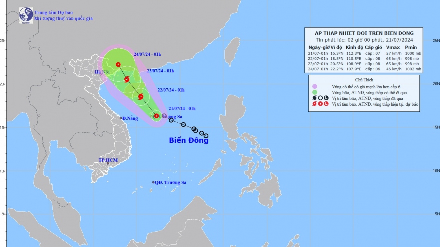 VOV.VN - Đến 13 giờ ngày 21/7, áp thấp nhiệt đới di chuyển theo hướng Tây Bắc, tốc độ khoảng 15 km/h, có khả năng mạnh lên thành bão; vị trí tâm bão cách đảo Hải Nam (Trung Quốc) khoảng 160km về phía Đông Nam.