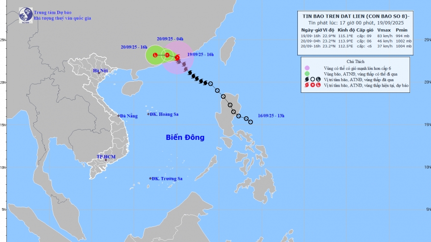VOV.VN - Theo Trung tâm Dự báo Khí tượng Thủy văn Quốc gia, lúc 19h ngày 19/9, bão số 8 đã đi vào đất liền phía Nam tỉnh Quảng Đông với sức gió mạnh cấp 8–9, giật cấp 11. Dự báo trong 24 giờ tới, bão sẽ suy yếu thành áp thấp nhiệt đới và tiếp tục đi sâu vào nội địa.