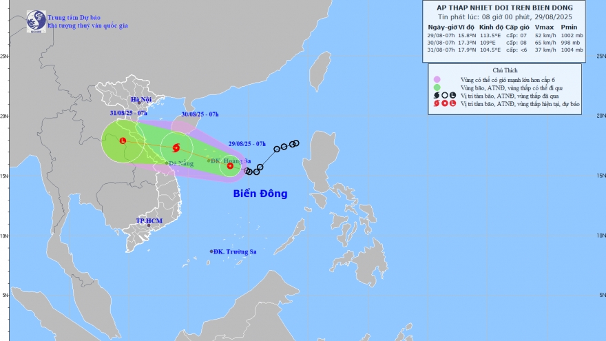VOV.VN - Dự báo trong 12 giờ tới, áp thấp nhiệt đới di chuyển theo hướng Tây Bắc, tốc độ 20-25 km/h và có khả năng mạnh lên thành bão. Đến 1h ngày 30/8, vị trí tâm bão ở khoảng 17,2 độ Vĩ Bắc; 109,8 độ Kinh Đông, trên vùng biển từ Quảng Trị đến Đà Nẵng, cách bờ biển Quảng Trị khoảng 360km