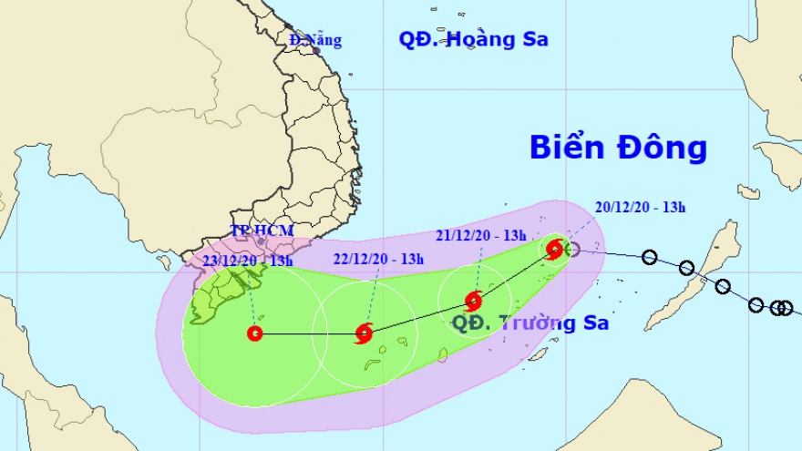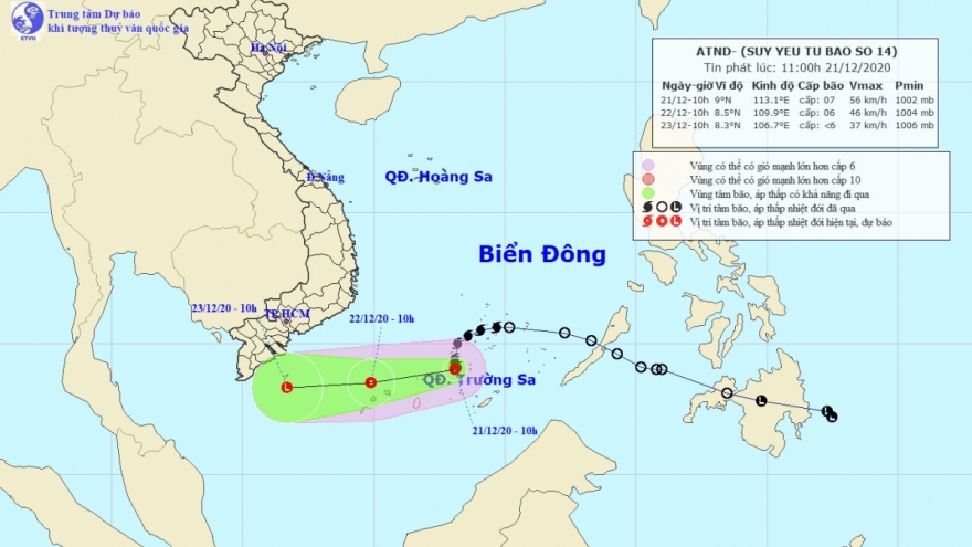 VOV.VN - Theo Trung tâm dự báo khí tượng Quốc gia, hồi 10 giờ, vị trí tâm áp thấp nhiệt đới ở vào khoảng 9,0 độ Vĩ Bắc; 113,1 độ Kinh Đông, cách Huyền Trân khoảng 270km về phía Đông Đông Bắc.