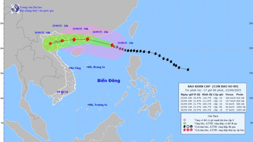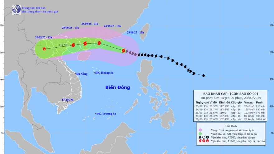 VOV.VN - Bão số 9 đang ở khu vực Đông Bắc Biển Đông với sức gió giật trên cấp 17, gây sóng cao trên 10 m. Dự báo từ ngày 24–26/9, toàn bộ vịnh Bắc Bộ gió mạnh, ven biển Quảng Ninh – Hải Phòng nước dâng 0,5–0,8 m. Bắc Bộ và Bắc Trung Bộ hứng mưa lớn 100–250 mm, có nơi trên 400 mm.