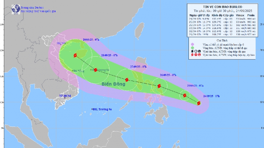 VOV.VN – Hồi 13h ngày 25/9, tâm bão BUALOI nằm ở khoảng 11,1 độ vĩ Bắc – 128,1 độ kinh Đông, trên vùng biển phía Đông Philippines. Với sức gió mạnh nhất vùng gần tâm đạt cấp 12 (118–133 km/h), giật cấp 15, bão di chuyển theo hướng Tây Tây Bắc với tốc độ 15–20 km/h