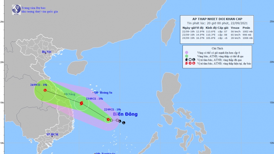 VOV.VN - Hồi 10h ngày 23/9, vị trí tâm áp thấp nhiệt đới ở vào khoảng 13,9 độ Vĩ Bắc; 111,3 độ Kinh Đông, cách bờ biển Phú Yên khoảng 230km, cách bờ biển Bình Định khoảng 210km, cách bờ biển Đà Nẵng khoảng 400km.