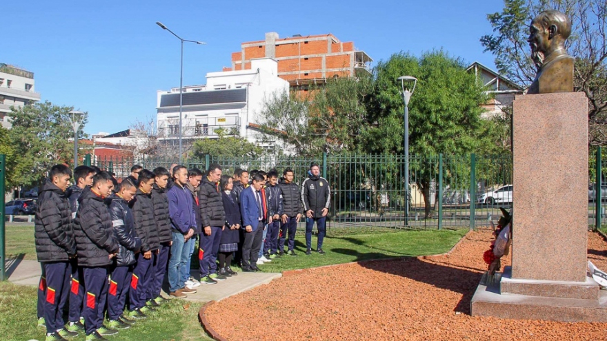 VOV.VN - Sau trận đấu giao hữu đầu tiên với ĐT Futsal Argentina, các thành viên ĐT Futsal Việt Nam có 1 ngày nghỉ ngơi và thăm quan thủ đô Buenos Aires. Cả đội đã dâng hoa tại tượng đài Chủ tịch Hồ Chí Minh ở Buenos Aires và thăm Đại sứ quán Việt Nam tại Argentina.