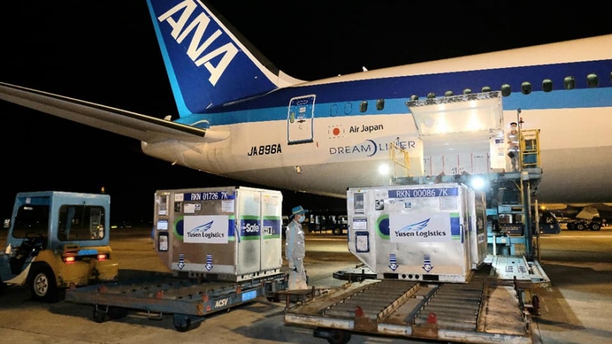 VOV.VN - Vào lúc 22h tối ngày 16/6, tại sân bay Quốc tế Nội Bài đã diễn ra lễ tiếp nhận lô vaccine gần 1 triệu liều phòng COVID-19 của Chính phủ Nhật Bản hỗ trợ Việt Nam phòng chống dịch.