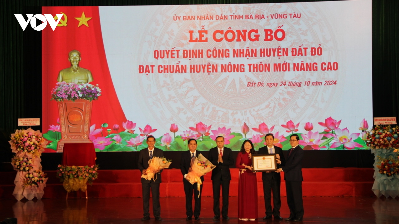 VOV.VN - Chiều nay (24/10), UBND tỉnh Bà Rịa – Vũng Tàu tổ chức lễ đón nhận huyện Nông thôn mới nâng cao đối với huyện Đất Đỏ. Đảng bộ, chính quyền và nhân dân huyện Đất Đỏ vinh dự và tự hào là huyện đầu tiên của tỉnh hoàn thành mục tiêu huyện Nông thôn mới nâng cao, sớm hơn 2 năm so với Nghị quyết Đại hội Đảng bộ huyện lần thứ XII, nhiệm kỳ 2020 – 2025 đề ra.