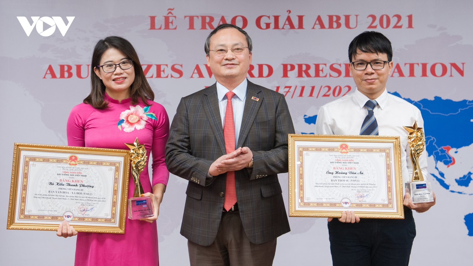 VOV.VN - Tối 29/11 (theo giờ Việt Nam), tại New Delhi, Ấn Độ, hai nhà báo Hoàng Ân và Thi Uyên của VOV đã vinh dự được nhận Giải xuất sắc trong Lễ trao Giải ABU 2022. Giám khảo ABU đã đánh giá cao những tác phẩm đoạt giải lần này của VOV.