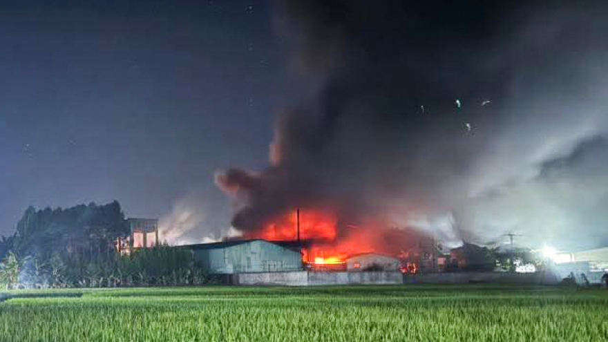 VOV.VN - Nhà xưởng rộng khoảng 1.000m2 của Công ty cổ phần may Năm Châu tại huyện Lạng Giang (Bắc Giang), gồm kho hàng, dây chuyền sản xuất, hoàn thiện đã bị ngọn lửa bao trùm trong đêm.
