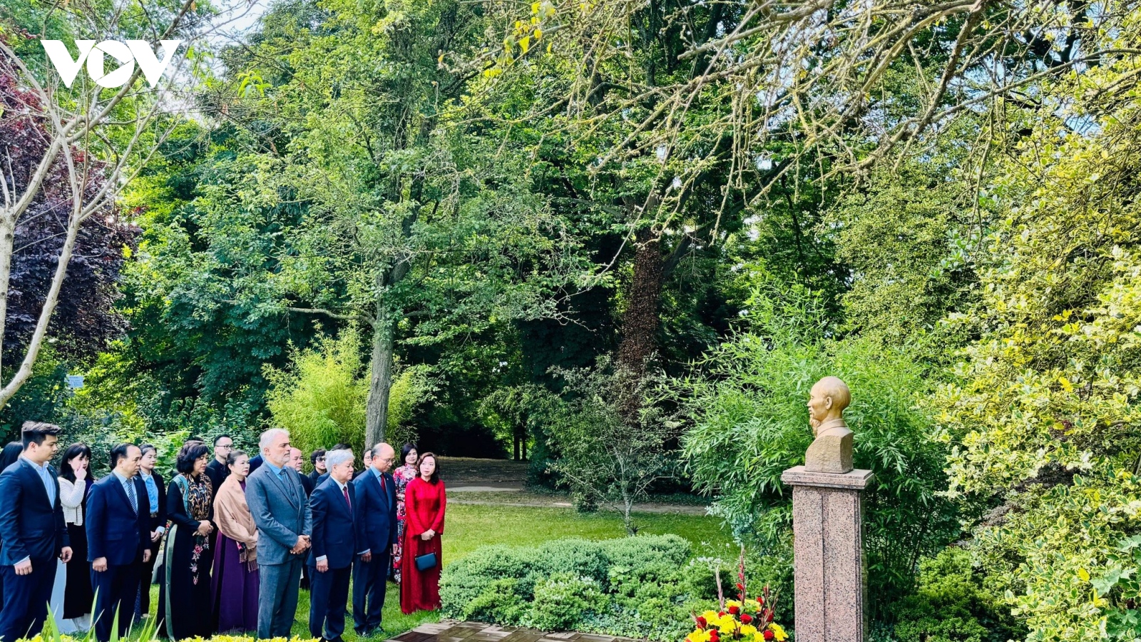 VOV.VN - Ngày 30/6, ông Đỗ Văn Chiến, Ủy viên Bộ Chính trị, Bí thư Trung ương Đảng, Chủ tịch Ủy ban Trung ương Mặt trận Tổ quốc Việt Nam đã tới dâng hoa tại tượng Chủ tịch Hồ Chí Minh trong Công viên Montreau ở thành phố Montreuil, thuộc ngoại ô Paris, Pháp.