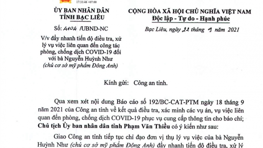 VOV.VN - Chủ tịch UBND tỉnh Bạc Liêu giao công an tỉnh tiếp tục chỉ đạo đẩy nhanh tiến độ điều tra và báo cáo kết quả, tiến độ thực hiện về UBND tỉnh trước ngày 30/9.