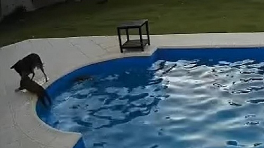 VOV.VN - Khi thấy chú chó mù Luna bị rơi xuống bể bơi và mất phương hướng, bằng trí thông minh của mình, chú chó con Caipirinha đã hướng dẫn bạn đến chỗ nước nông, sau đó kéo bạn lên bờ.