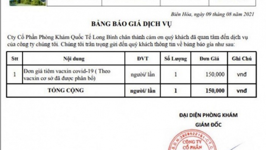 VOV.VN - Chiều 12/8, CDC Đồng Nai thông tin về việc xử lý Phòng khám đa khoa quốc tế Long Bình (phường Long Bình, TP Biên Hòa) đăng thông tin quảng cáo và bảng giá tiêm vaccine ngừa Covid-19.