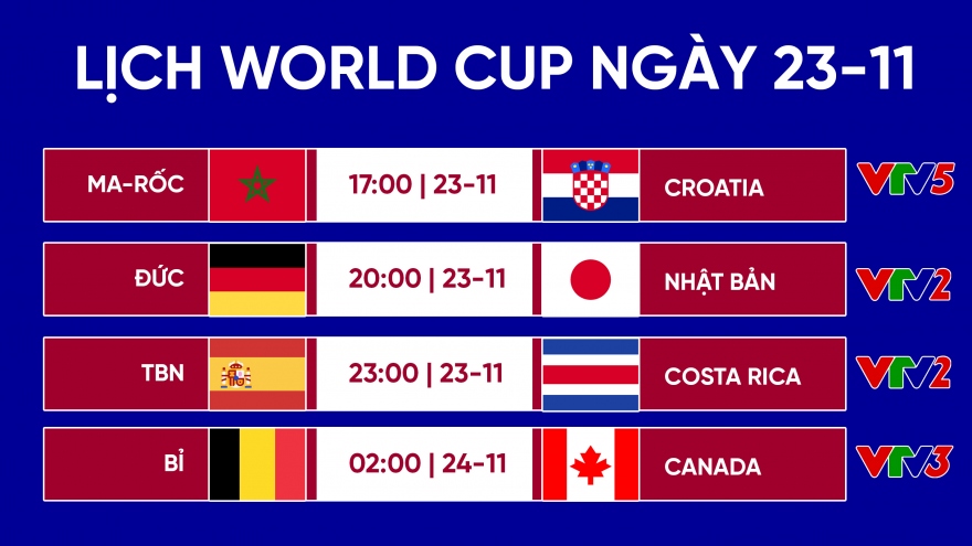 VOV.VN - Lịch thi đấu World Cup 2022 hôm nay 23/11 và rạng sáng 24/11, nhiều đội bóng lớn như Đức, Tây Ban Nha, Bỉ sẽ bắt đầu hành trình trên đất Qatar.