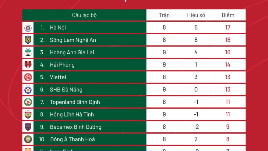 VOV.VN - Bảng xếp hạng sau vòng 8 V-League 2022, HAGL vươn lên thứ ba với 13 điểm, chỉ kém 1 điểm so với hai vị trí dẫn đầu của Hà Nội FC và Hải Phòng.