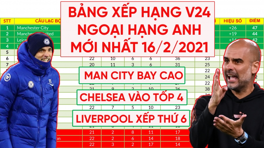Bảng xếp hạng Ngoại hạng Anh mới nhất: MU tung cờ trắng, Chelsea rộng cửa vào tốp 4VOV.VN - Cập nhật bảng xếp hạng Ngoại hạng Anh 2020/2021 sau các trận đấu của vòng 24 diễn ra sáng nay 15/2.