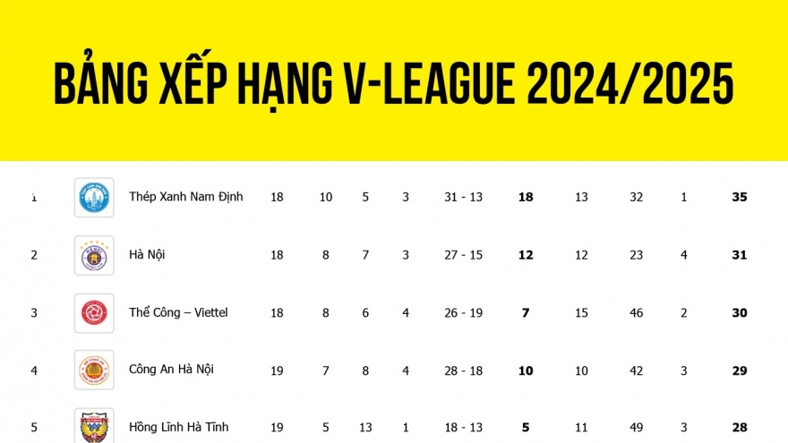 VOV.VN - Tại vòng 20 V-League 2024/2025, người hâm mộ bóng đá Việt Nam có thể được chứng kiến màn đổi ngôi dẫn đầu trên bảng xếp hạng sau hai cặp đấu trên sân vận động Thiên Trường và Hàng Đẫy.