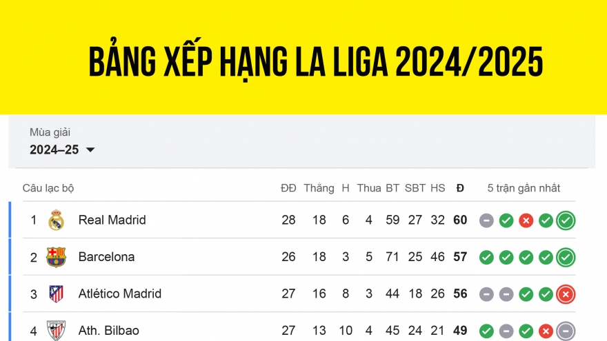 VOV.VN - Cập nhật bảng xếp hạng La Liga 2024/2025 mới nhất, Real Madrid vượt qua Barca để dẫn đầu sau chiến thắng trước Villarreal ở vòng 28. Tuy nhiên, Los Blancos đã thi đấu nhiều hơn Barca 2 trận.