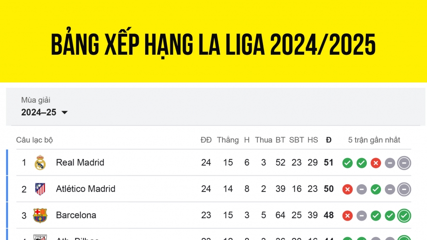 VOV.VN - Cập nhật bảng xếp hạng La Liga 2024/2025 tính đến sáng 16/2, do Real Madrid và Atletico Madrid đều bị cầm hòa ở vòng 24 nên nếu Barca thắng ở trận đấu muộn, đội bóng này sẽ leo lên dẫn đầu.