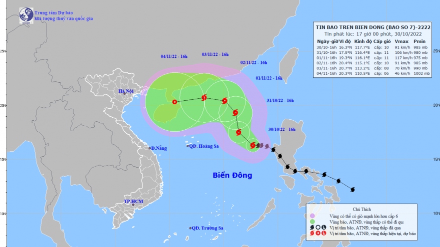 VOV.VN - Trong 24 giờ tới, bão số 7 di chuyển theo hướng Tây Tây Bắc, tốc độ 10-15 km/h, cách quần đảo Hoàng Sa khoảng 490km về phía Đông, cường độ cấp 10-11, giật cấp 13.