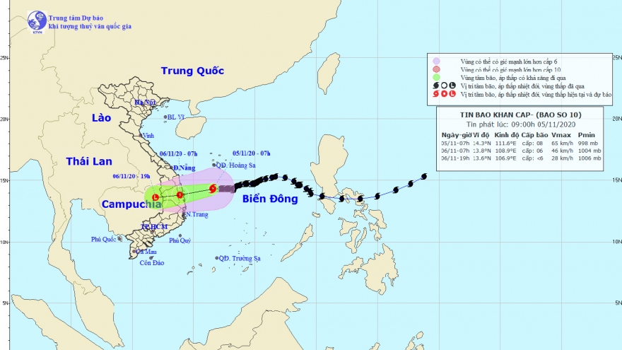 VOV.VN - Dự báo trong 24 giờ tới, bão số 10 di chuyển theo hướng Tây Tây Nam, mỗi giờ đi được 10-15km, suy yếu thành áp thấp nhiệt đới đi vào đất liền các tỉnh từ Quảng Ngãi đến Phú Yên.