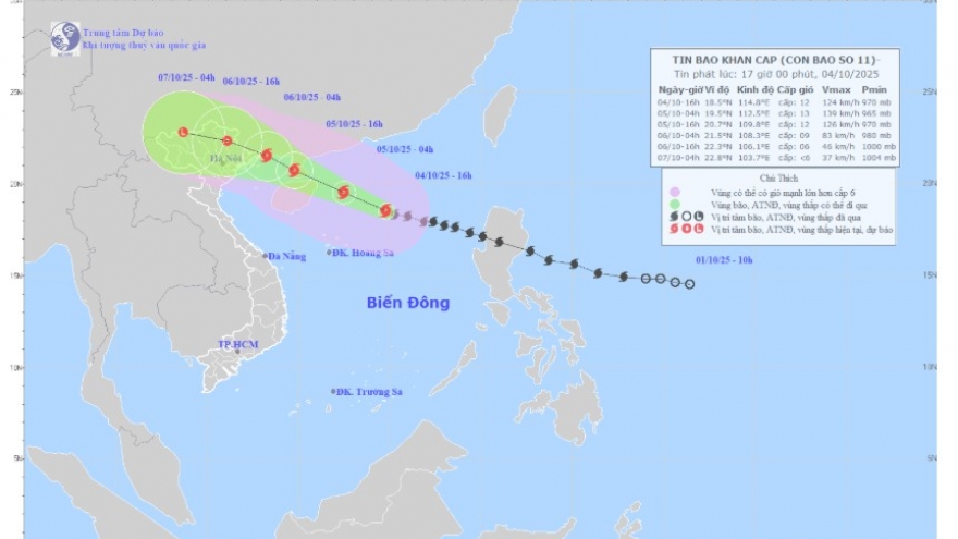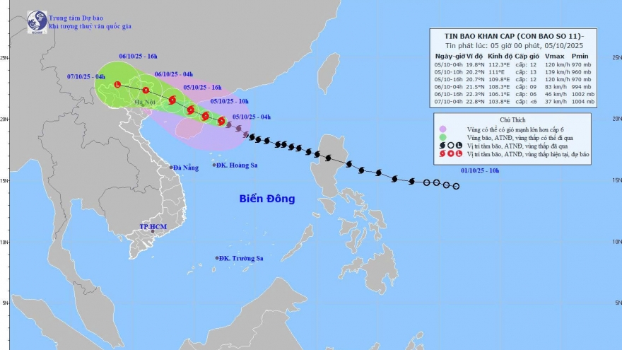 VOV.VN - Sáng nay (5/10), bão số 11 đang hoạt động trên vùng biển Tây Bắc Biển Đông, cách Quảng Ninh khoảng 550 km. Sức gió mạnh nhất gần tâm bão đạt cấp 12, giật cấp 15. Dự báo từ chiều tối nay, bão sẽ ảnh hưởng trực tiếp đến khu vực Bắc Bộ và Bắc Trung Bộ với gió mạnh, sóng lớn, nước dâng ven biển cùng mưa to đến rất to trên diện rộng.