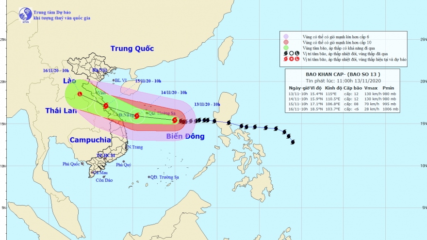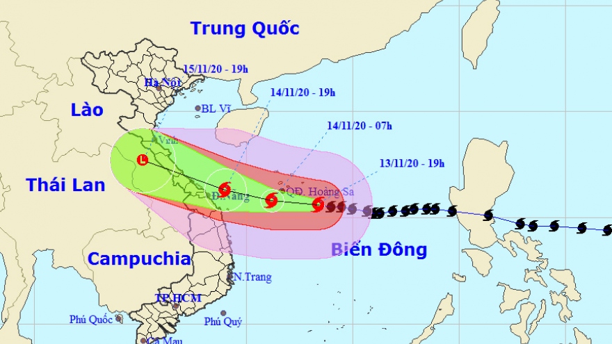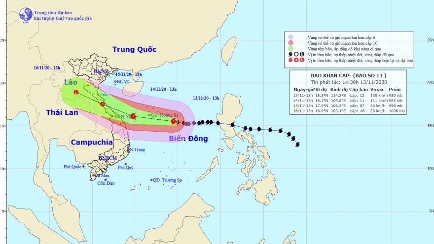 VOV.VN - Đến 13 giờ ngày 14/11, vị trí tâm bão ở 16,1 độ Vĩ Bắc; 109,8 độ Kinh Đông, trên vùng biển từ Quảng Bình đến Quảng Ngãi. Sức gió mạnh nhất vùng gần tâm bão mạnh cấp 11 (100-115km/giờ), giật cấp 14.